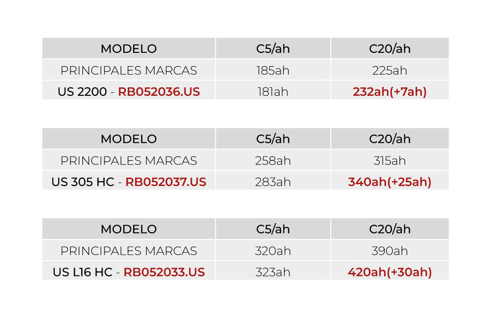 Las pruebas hablan por sí solas. Frente a otras baterías equivalentes del mercado, las US Battery ofrecen mayor capacidad en C20, descargas más estables y una vida útil superior.